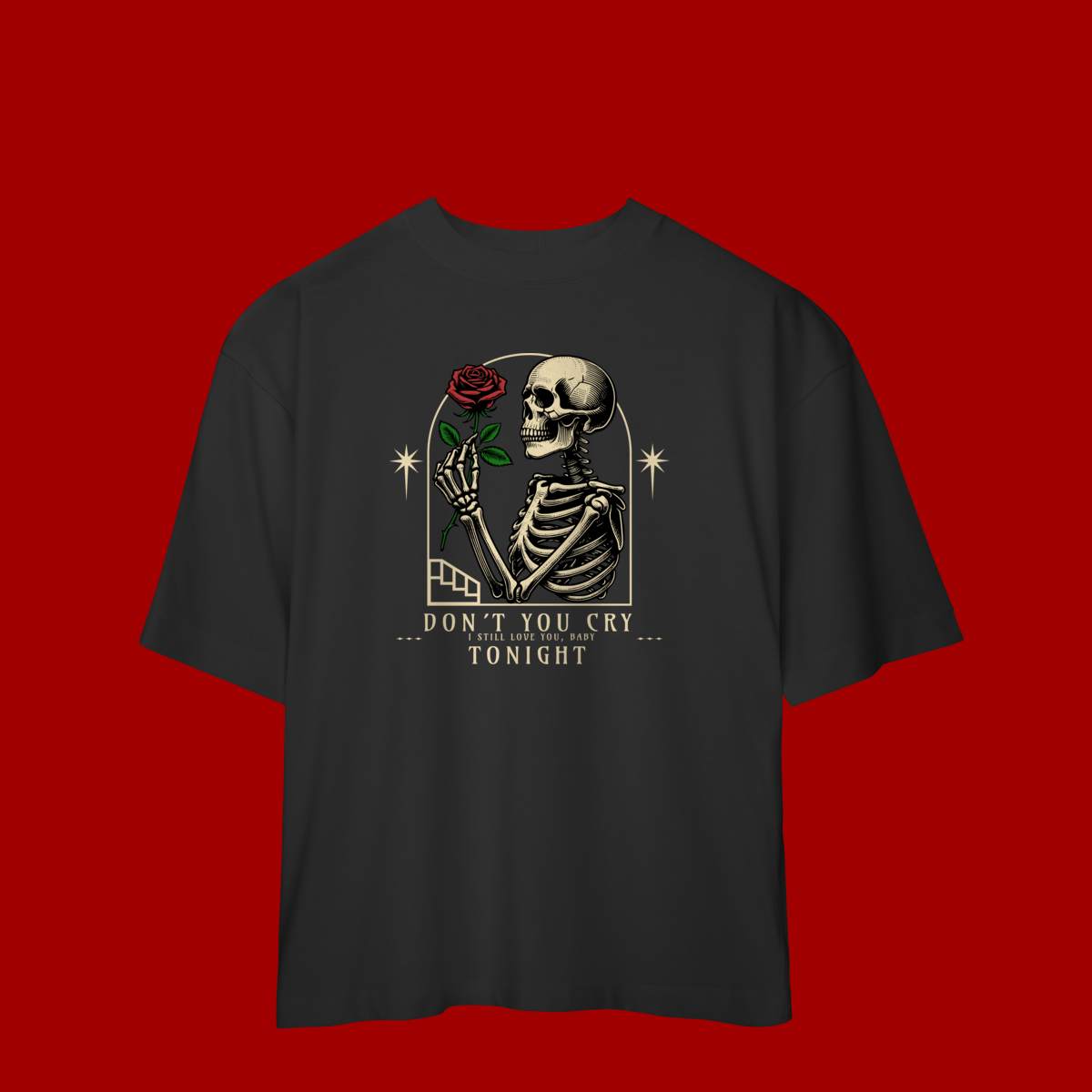 O contraste entre o esqueleto e a delicadeza da rosa simboliza força, sensibilidade e despedidas silenciosas, enquanto a frase icônica adiciona um tom emocional que fala diretamente ao coração de quem vive intensamente. Com caimento amplo e confortável, a peça entrega estilo urbano, alternativo e moderno, perfeita para quem ama estética dark com um toque romântico.