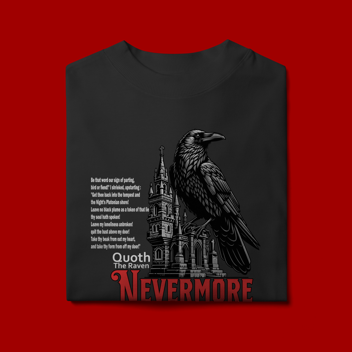 Com caimento amplo e confortável, a peça une literatura clássica à estética dark contemporânea. O trecho selecionado “Quoth the Raven: ‘Nevermore’”  reforça a atmosfera enigmática do poema, enquanto a ilustração do corvo acrescenta profundidade e presença ao design.